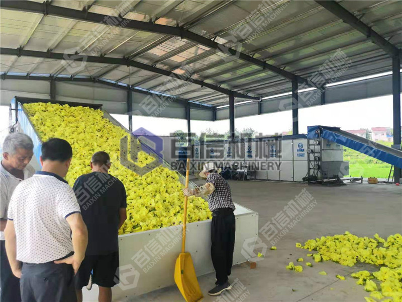 菊花為菊科多年生草本植物,通常以其干燥的頭狀花序入藥。新鮮菊花含水量較高,其中花瓣部分含水量較少,組織較嫩,容易干燥,而花頭部分含水量特大,可達80%以上,且組織較老,不易失水,亦即菊花花頭是一種組織很 不均勻的藥材。干菊花大多用于泡茶飲用,具有味濃香甜、去膩消食、醒腦益神之功能。因此,對于菊花的色、香、形、味要求很高,要求干燥后原色、原味、原樣,這就要求熟化后烘干,對芘頭部分進行強干燥,而對花瓣部分進行弱干燥。而目前先蒸熟后曬干的傳統干燥工藝不但是靠天吃飯,而且造成花瓣部分過分干燥、瓣片脫落,干燥后的菊花質量達不到要求。?